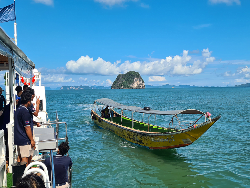 ไกด์พาทุกท่านขึ้นเรือ พร้อมเสริฟ Welcome drink ให้กับทุกท่าน และออกเดินทางจากท่าเรือ มุ่งหน้าสู่ อ่าวพังงา ในระหว่างทางนั้น สามารถเดินเล่นบนเรือ ชมทัศนีย์ภาพที่สวยงามของธรรมชาติ หรือถ่ายรูปตามมุมสวยๆบนเรือได้ตามอัธยาศัย