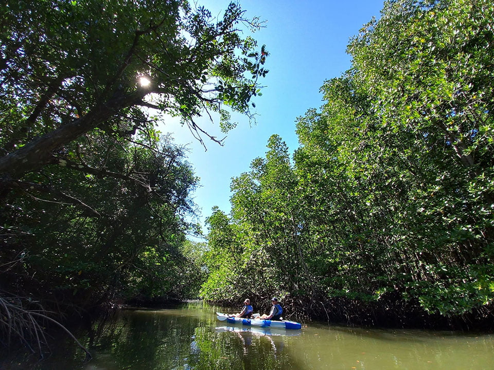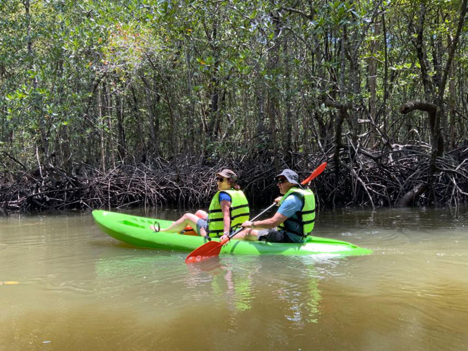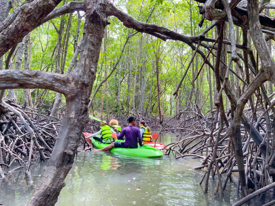 ออกเดินทางสำรวจป่าชายเลนอันอุดมสมบูรณ์ บริเวณทิศใต้ของเกาะยาวใหญ่ ล่องเรือคายัคไปตามคลองอันเงียบสงบ ผ่านร่มไม้ของป่าโกงกาง ฟังเสียธรรมชาติ สนุกไปกับการเรียนรู้ระบบนิเวศของป่าชายเลน แวะชมกระชังปลา ของชาวบ้านที่ตั้งอยู่กลางป่าโกงกาง ที่มีทั้ง กุ้ง หอย ปู ปลา
