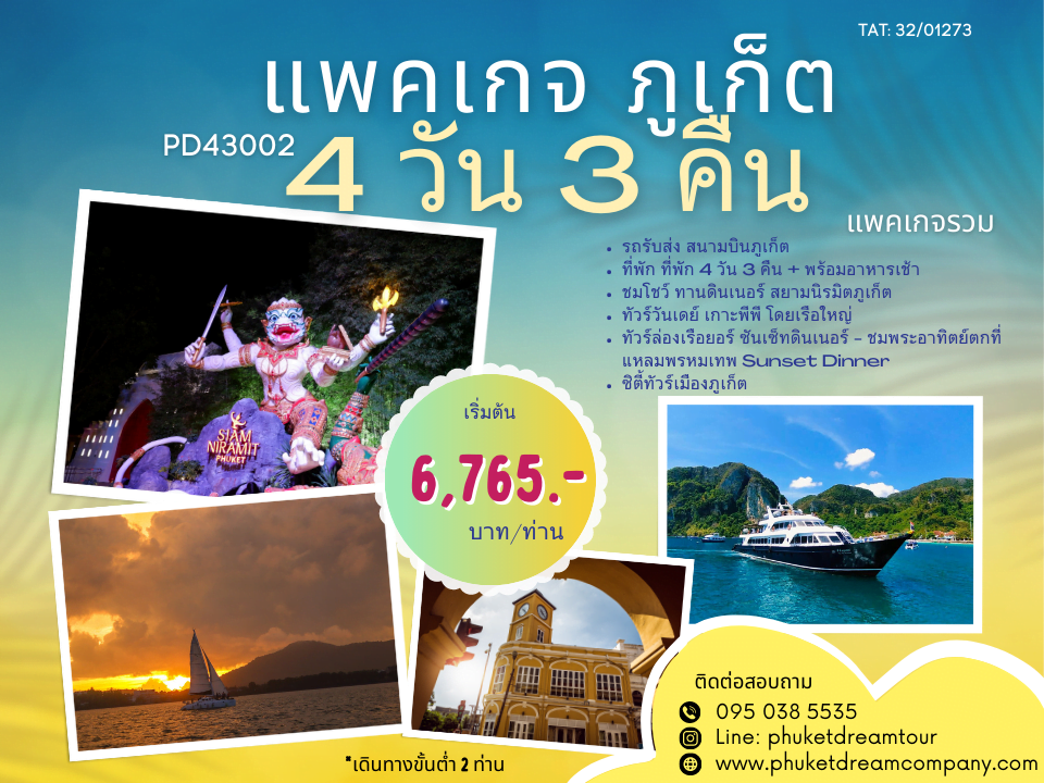 ทัวร์ภูเก็ต ดรีมขอแนะนำแพคเกจทัวร์ รวมที่พัก แบบ 4 วัน 3 คืน สำหรับท่านที่ต้องการมาใช้ช่วงเวลาวันหยุดที่จังหวัดภูเก็ต และต้องการให้ทางเราจัดบริการรวมทุกอย่างให้ลูกค้าแล้ว โดยแพคเกจจะรวมตั้งแต่บริการรับจากสนามบินภูเก็ต หรือ บขส และส่งเข้าที่เพื่อให้พักผ่อนได้ตามอัธยาศัย หลังจากนั้นประมาณ 17.00 น. เตรียมพร้อมที่หน้าล๊อบบี้ เพื่อเดินทางไปชมโชว์สุดอลังการ และทานอาหารค่ำ ที่สยามนิรมิต ภูเก็ต และวันที่ 2 เตรียมตัวออกเดินทางไปทัวร์วันเดย์ เกาะพีพี โดยเรือใหญ่ และวันที่ 3 ไปทัวร์ทัวร์ล่องเรือยอร์ ซันเซ็ทดินเนอร์ – ชมพระอาทิตย์ตกที่แหลมพรหมเทพ Sunset Dinner และวันที่ 4 พาเที่ยวชมเมือง ซิตี้ทัวร์ภูเก็ต. พักผ่อนตามอัธยาศัยตามที่ลูกค้าเลือกที่พัก ไม่ว่าจะเป็นที่พักเขตในเมือง ป่าตอง กะตะ กะรน และราไวย์